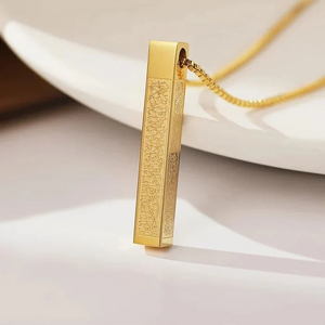 Islamic Gold-Tone Bar Pendant Necklace – A modern vertical pendant engraved with Quranic verses, offering a meaningful blend of faith and style.